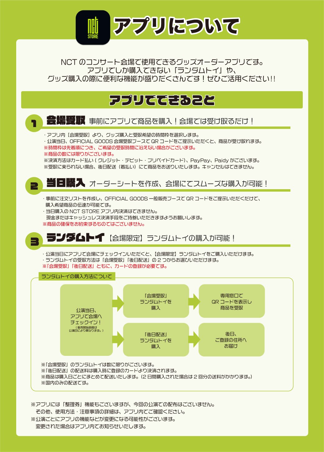 ※オンラインでご購入された商品は参加される公演までのお届けをお約束することはできかねます。会場にてグッズをご利用予定のお客様は、「NCT STORE」アプリでの「会場受取」か「一般販売」をご利用ください。